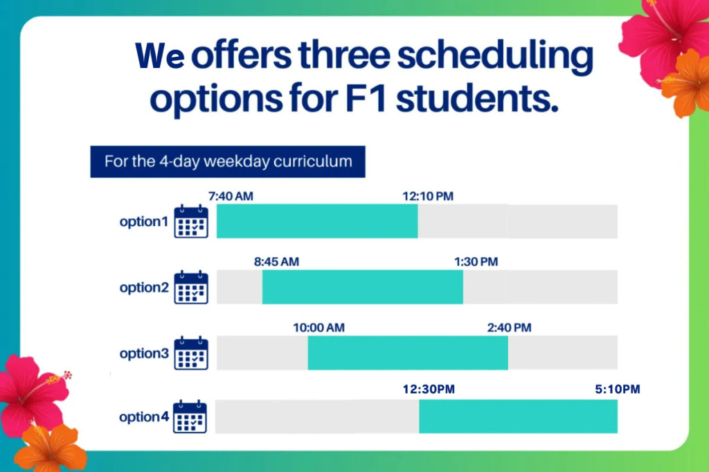 Many students at Academia are parents handling their children’s transportation. There are three schedule options for the four-day weekday curriculum: