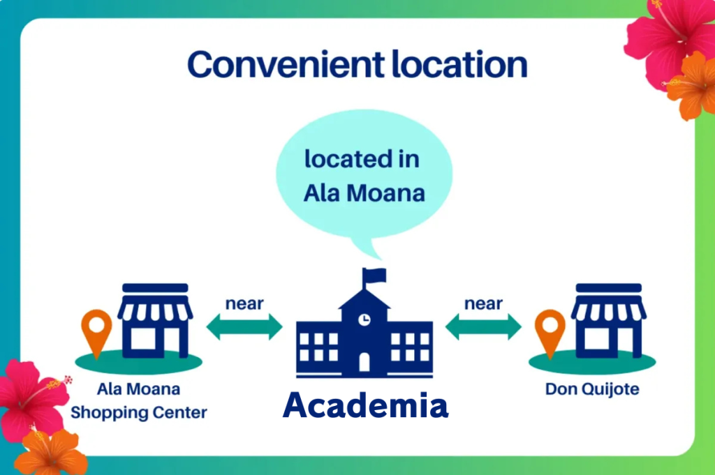 Academia is located in Ala Moana, with very convenient access. It is near Don Quijote and Ala Moana Shopping Center, making it handy for shopping after classes.