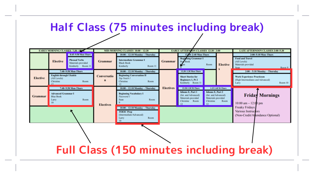 From 7:30 AM to 5:30 PM, various classes are offered for each level. Attend the classes selected during your class placement interview.