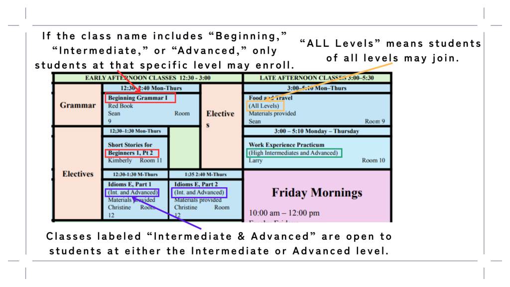 These classes are a great opportunity for students to make friends across levels while learning English. Come spend a fun Friday with us!
